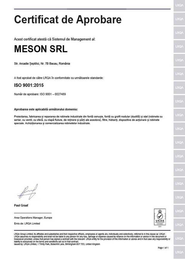 Sistemul de Management a Calitatii din cadrul Meson Romania corespunde cu cerintele ISO 9001-2015, este aplicat si implementat riguros astfel incat avem posibilitatea sa livram clientilor nostri doar produse performante si de calitate superioara.
