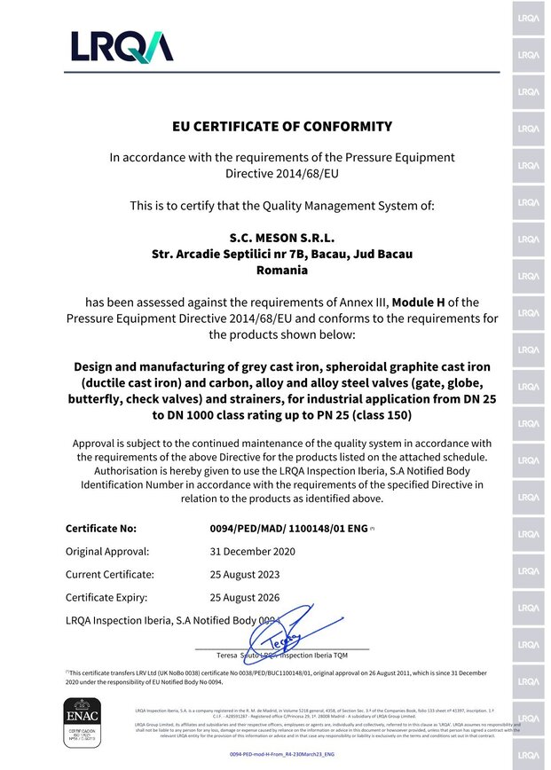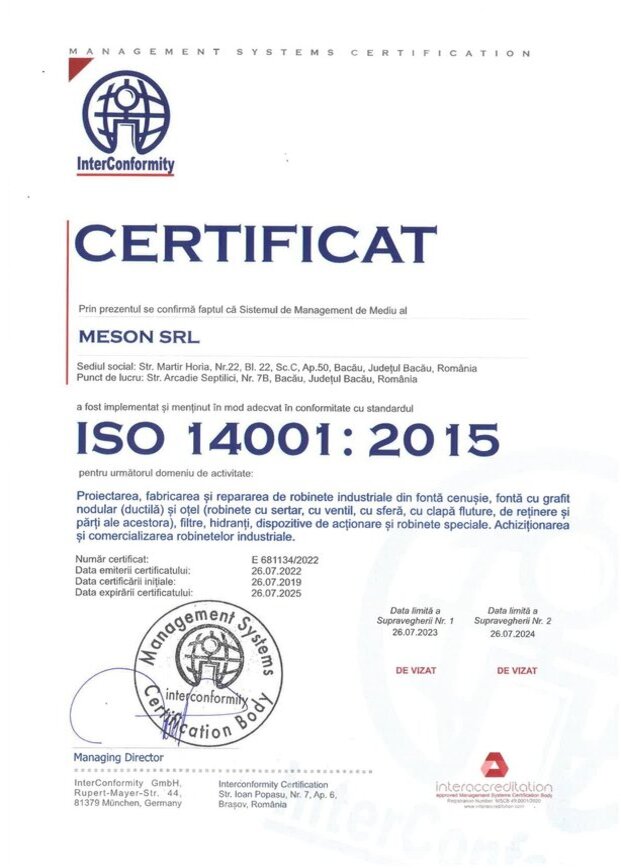 Sistemul de Management a Calitatii din cadrul Meson Romania corespunde cu cerintele ISO 9001-2015, este aplicat si implementat riguros astfel incat avem posibilitatea sa livram clientilor nostri doar produse performante si de calitate superioara.